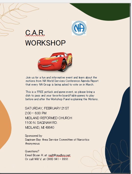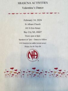Valentine’s Day Dance Feb. 14 Conference Agenda Report Work Shop 2/21/226 Necomer Event Fundraiser Feb 28 St. Patrick’s Day Dance March 14 PDF Of the 2026 Retreat Registration [pdf-embedder url=”https://michigan-na.org/saginaw-bay-area/wp-content/uploads/sites/8/2025/11/Registration-2026-Retreat-Flyer-11-7-25.pdf” title=”Registration 2026 Retreat Flyer 11-7-25″] Just Stay WTMTE Meeting Friday Night Conference Agenda Report Workshop Feb 21,2026